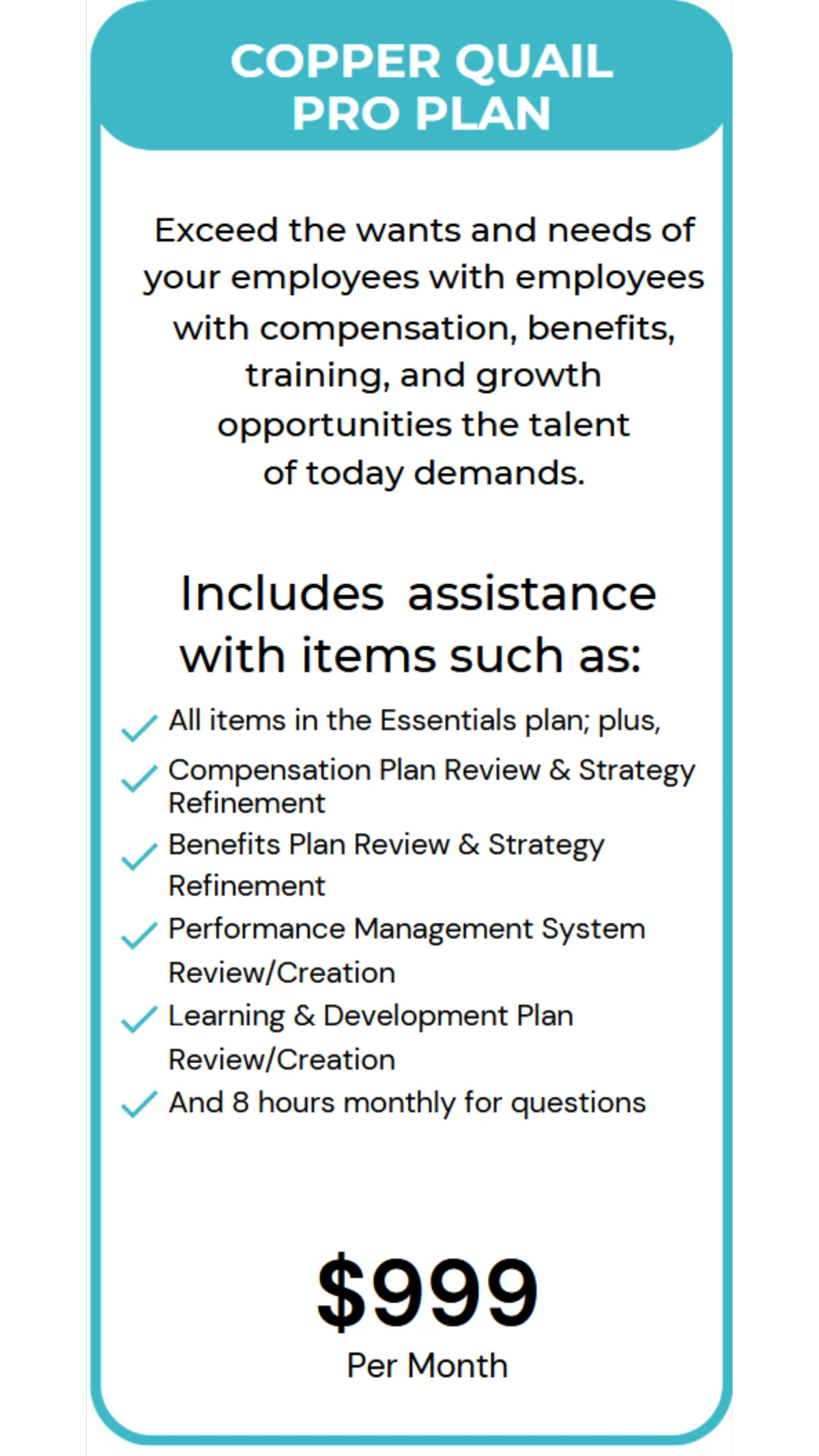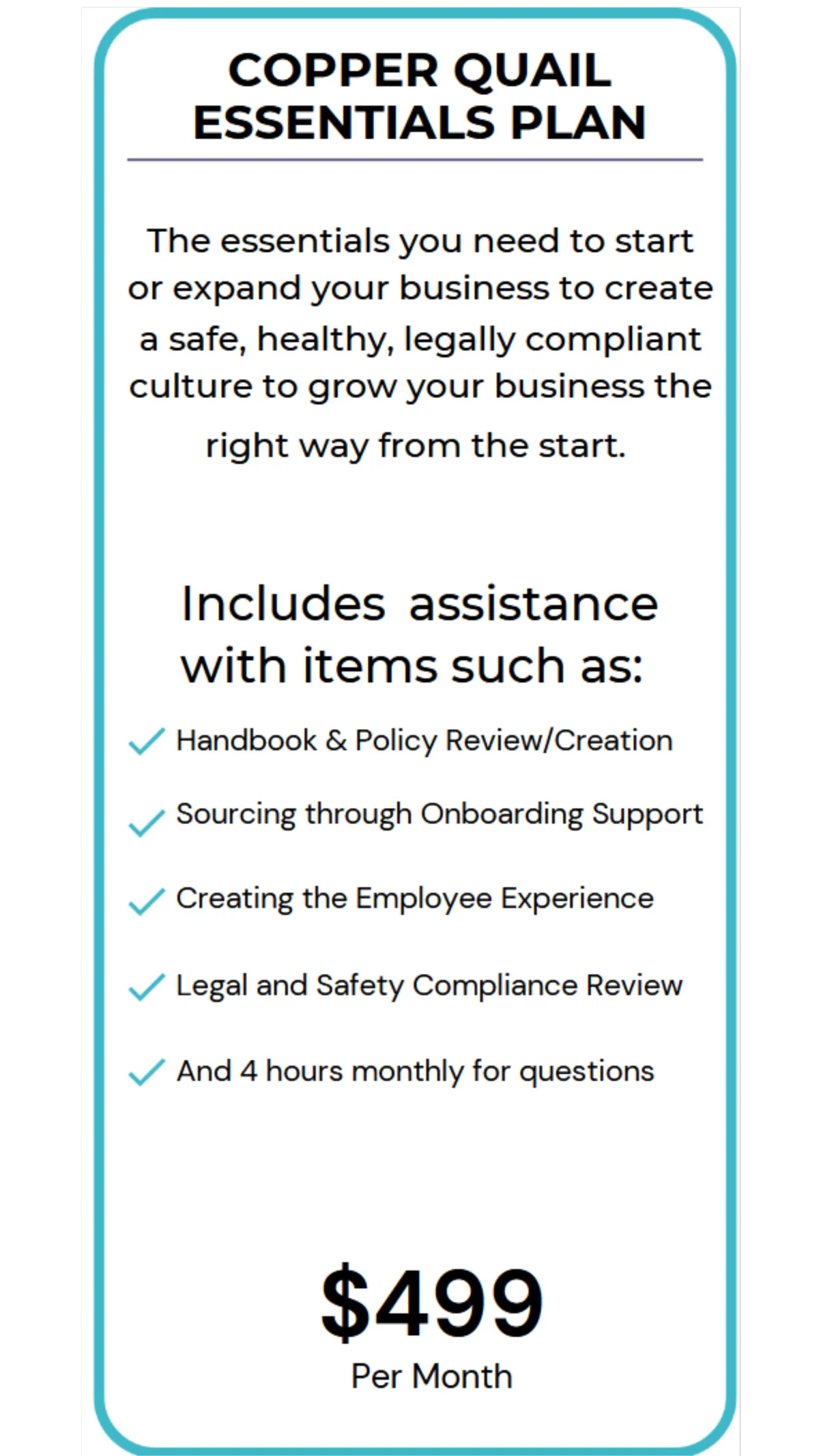 Copper Quail Consulting has provided turnkey HR solutions for busy owners on the go since 2017. Owners like you need a partner in creating recruiting, hiring, onboarding, training, retention, compensation, benefits programs, and more. Also, have an HR executive on standby to take your tough employee situation calls.